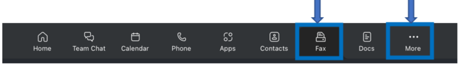 Open the Zoom app on your device and tap the More button (on mobile) or click the Fax tab (on desktop). (Note: this will not appear for you until it has been configured):