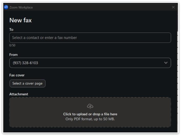 Sending and receiving faxes through Zoom is quick and straightforward. Note: Zoom Fax works by sending PDF documents. If you have a physical document you need to fax, use a copier on campus to scan, and email a copy of the file to yourself before starting the Zoom Fax process. The file you want to send must be in PDF format and has a size limit of 50mb. You can attach multiple documents.