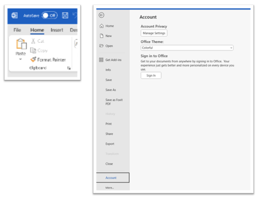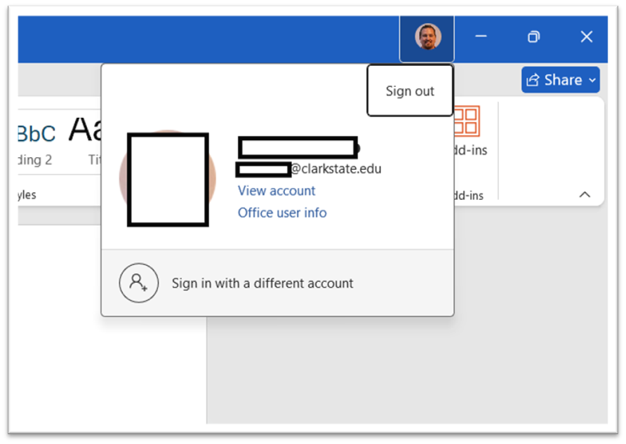Alternatively, if that box does not appear, you can log in to Office with your Clark State account by clicking on File in the top left corner, then clicking on Account, and then Sign In with your Clark State email and password.